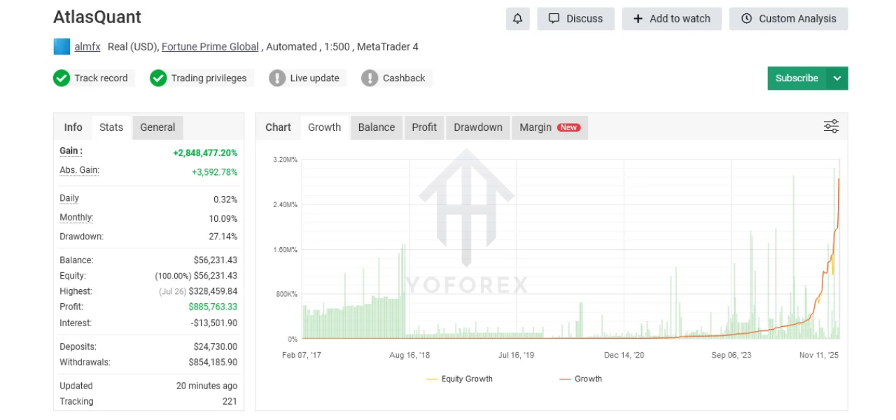 Atlas Quant EA is considered moderate-risk. It does not open large clusters of trades, keeping the account safe from rapid equity drops.