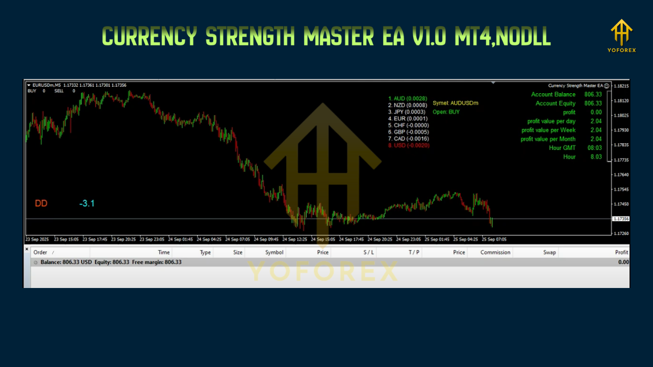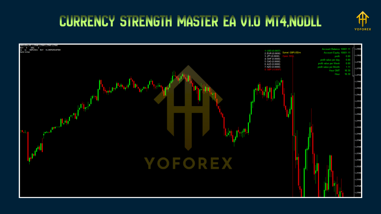 - Currency Strength Analysis: The EA uses a proprietary algorithm to calculate the relative strength of currencies. It analyzes multiple timeframes and currency pairs to determine the most optimal trades based on strength imbalances.