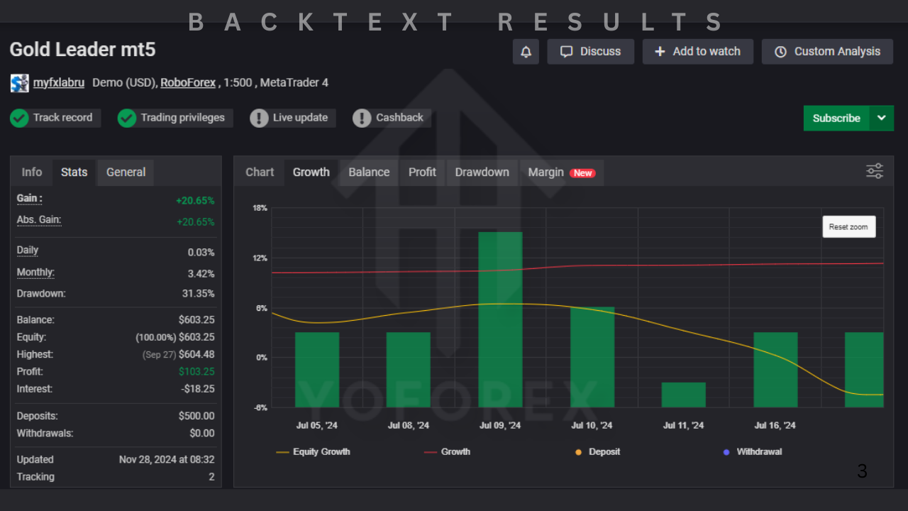 This Expert Advisor is specifically designed for MetaTrader 5, using smart algorithms that analyze gold’s price behavior, volatility cycles, and breakout phases. The result is a reliable automated system that targets consistent profits while controlling risks.
