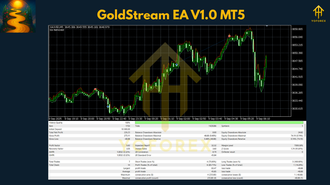 Built for the modern MT5 environment, GoldStream EA leverages the platform’s superior speed, order execution, and backtesting capabilities. MT5 allows multi-threaded optimization and improved trade logging — both critical for analyzing and refining automated strategies.