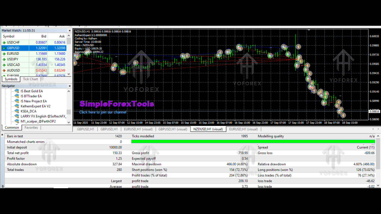 In backtesting, the KelhemExpert EA V2.0 MT4 has shown consistent performance on a variety of market conditions. When tested on historical data, it exhibited solid profits across multiple pairs, including EURUSD, GBPUSD, and AUDJPY. The risk-to-reward ratio has remained favorable, and the drawdowns have been manageable, especially when proper risk settings are configured.