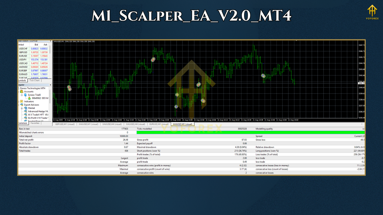 M1 Scalper EA V2 is an advanced high-frequency trading Expert Advisor designed for M1 timeframe on MetaTrader 4. It’s engineered for ultra-short scalping across major currency pairs and XAUUSD (gold).