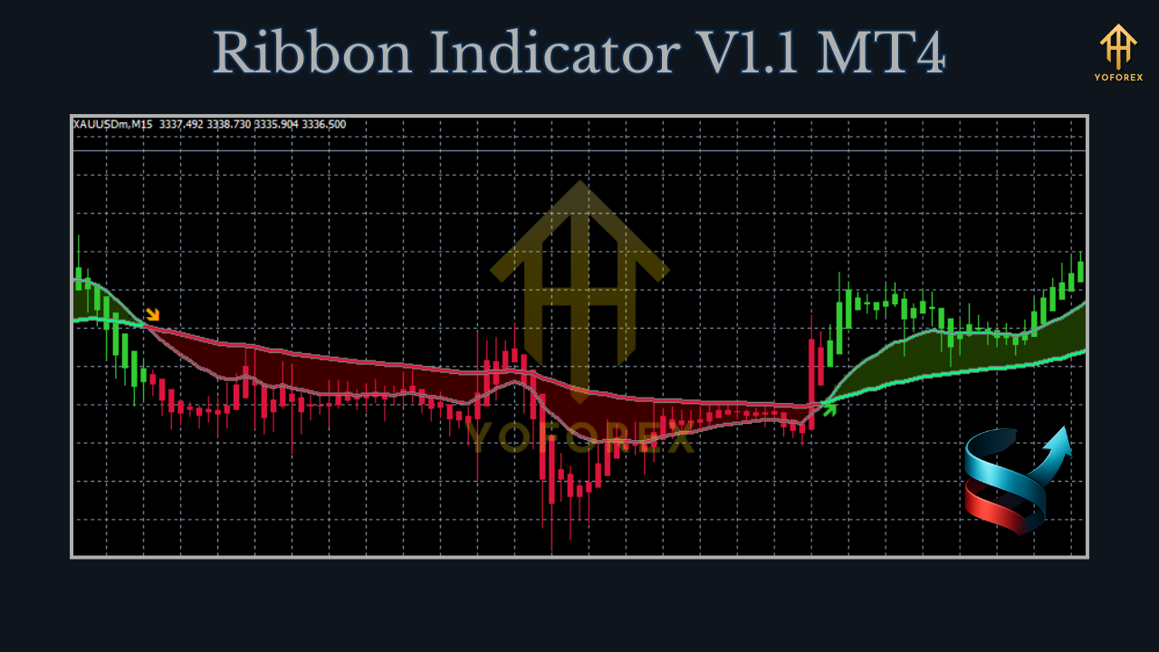Ribbon Indicator V1.1 (MT4) plots a bundle of moving averages (your choice of EMA/SMA/SMMA) and compresses the read into a color state: