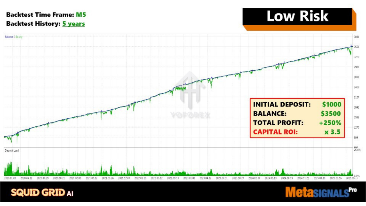 Squid Grid AI EA can trade up to six uncorrelated symbols simultaneously—spreading risk across major forex pairs, commodities, and indices. This portfolio approach reduces drawdown during instrument-specific shocks.