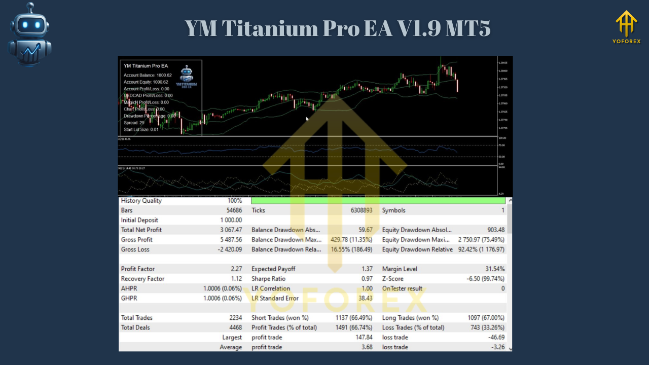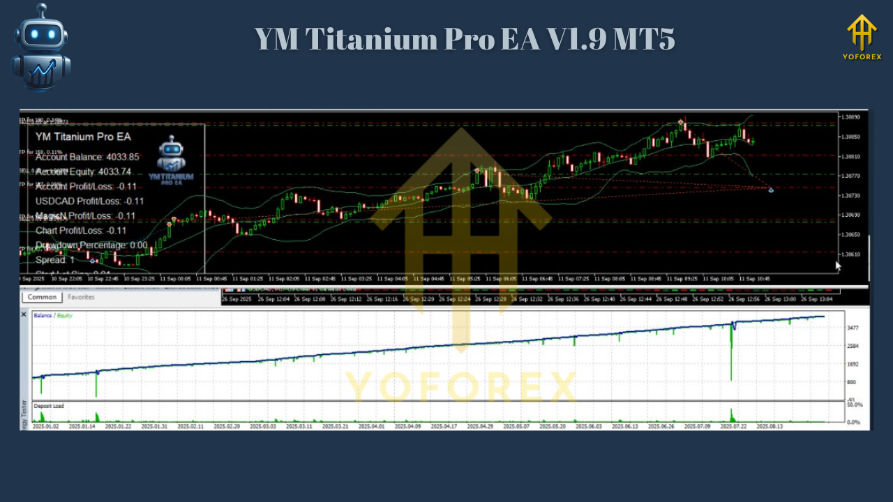 The YM Titanium Pro EA V1.9 MT5 is a scalping and intraday trading robot optimized for three carefully selected pairs — USDCAD, NZDUSD, and EURCHF. It provides flexibility in trade confirmations, advanced risk management, and smart scaling mechanisms to balance profits with account safety.