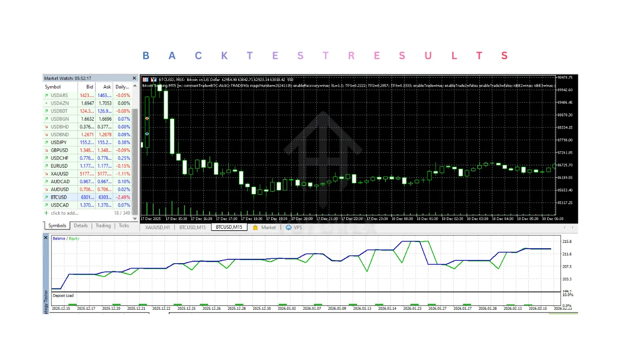 - Optimization: Backtest on MT5's Strategy Tester with historical BTC data.
