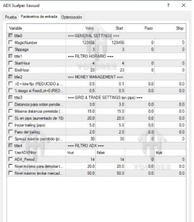 The ADX Scalper XAUUSD EA V1.50 MT4 offers a range of settings that can be fine-tuned for optimal performance. Here are some recommended parameters for various market conditions: