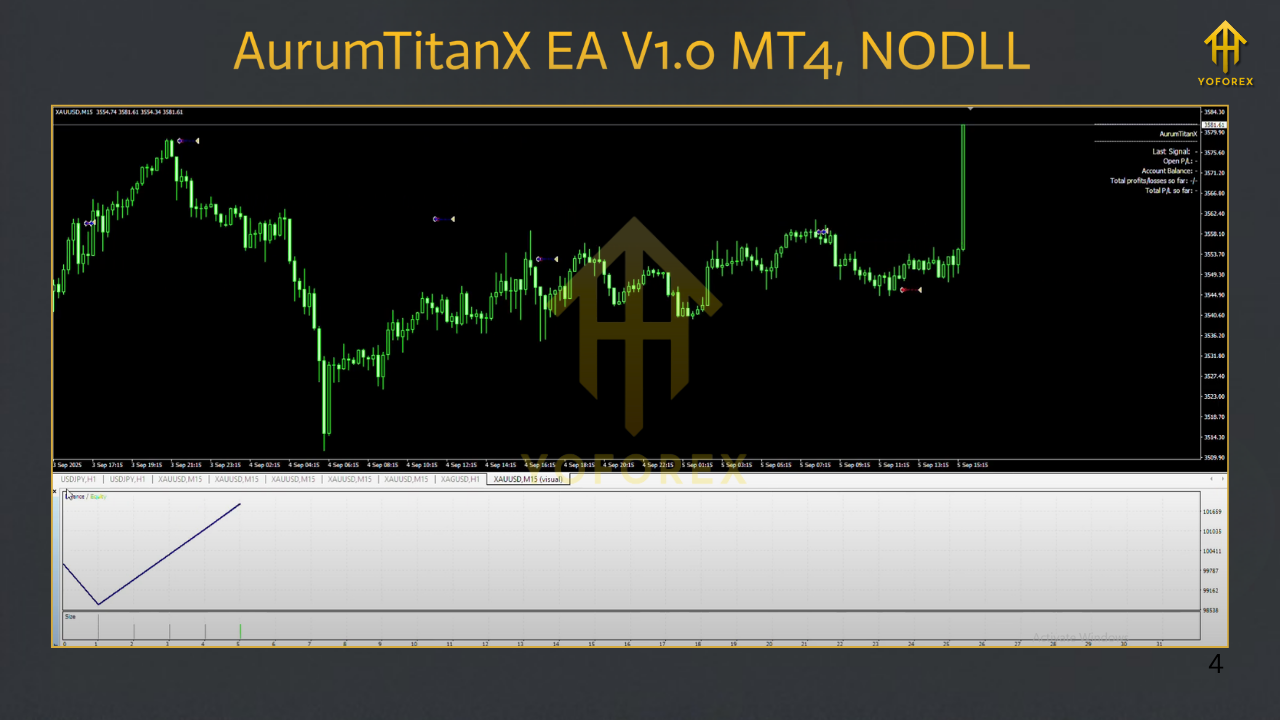 - AurumTitanX EA specializes in XAUUSD, the most liquid and volatile asset in the forex market. Gold’s price movements are highly influenced by global economic factors, and this EA takes advantage of those price fluctuations with optimal entry points.