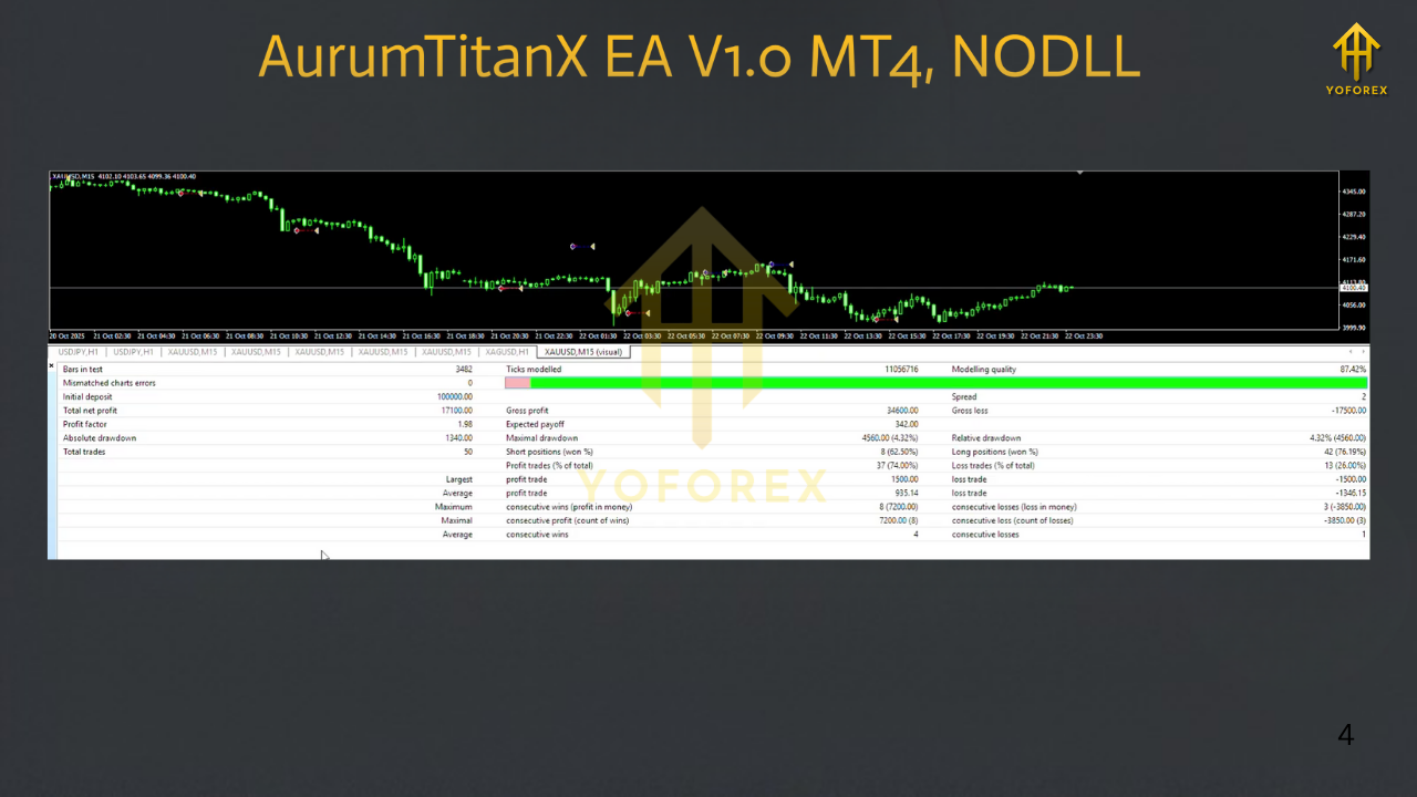 Introducing AurumTitanX EA V1.0 MT4, an advanced Expert Advisor designed for serious traders who want to dominate the XAUUSD (Gold) market. Whether you're a seasoned pro or a beginner, this MT4 EA provides a comprehensive trading solution, combining cutting-edge technology with proven trading strategies. The AurumTitanX EA V1.0 is built to identify profitable opportunities in the gold market, offering unmatched precision, advanced risk management, and consistent performance.