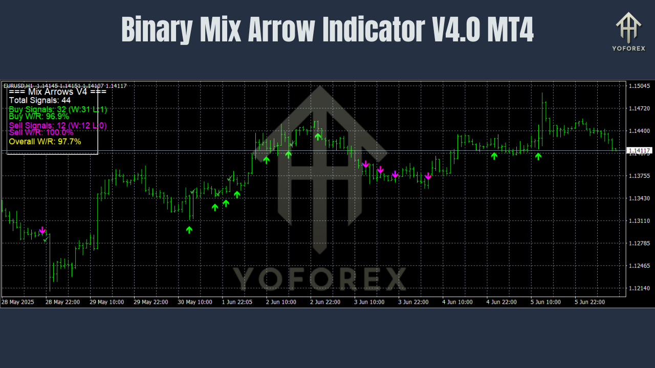Backtesting shows Binary Mix Arrow Indicator V4.0 MT4 provides solid accuracy across modes.