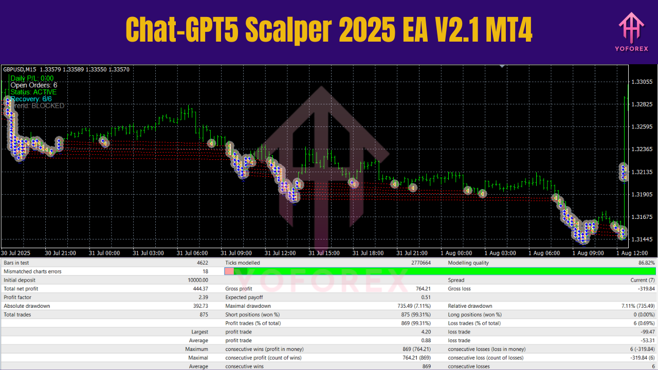 The Chat-GPT5 Scalper 2025 EA V2.1 MT4 is built on next-gen algorithmic trading combined with GPT-style adaptive AI logic. Unlike static scalpers, it can adjust to market conditions in real time.