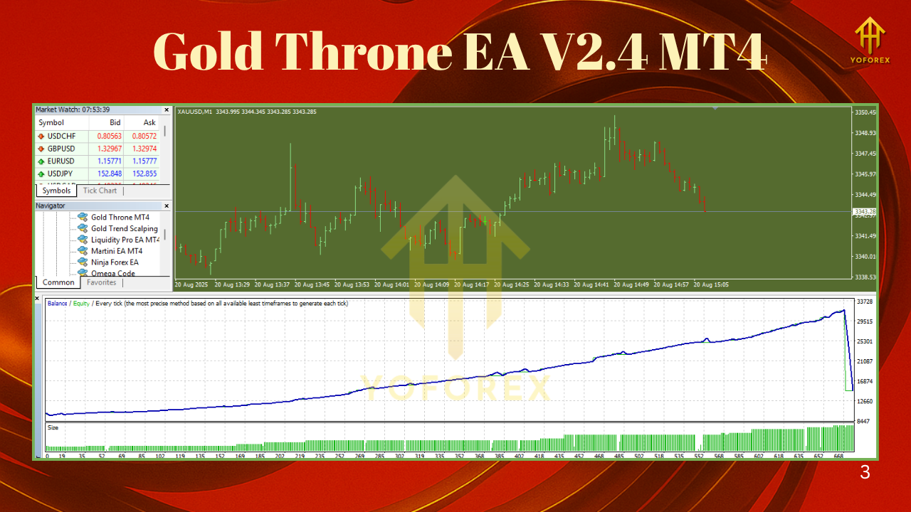 Whether you’re a beginner just stepping into the gold market or a seasoned trader managing multiple accounts, Gold Throne EA is your personal automated powerhouse. It doesn’t chase random signals—it analyzes deep price structure, volume shifts, and volatility zones to predict where gold will move next.