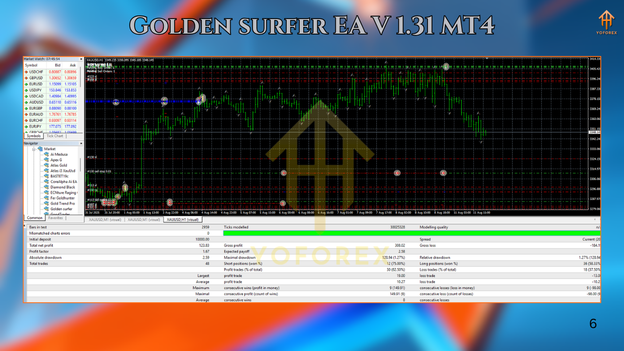 Golden Surfer EA isn’t your average robot. It’s built around price action synchronization and volatility timing, allowing it to adapt to different gold market moods—whether it’s a strong bullish rally or a choppy consolidation phase.