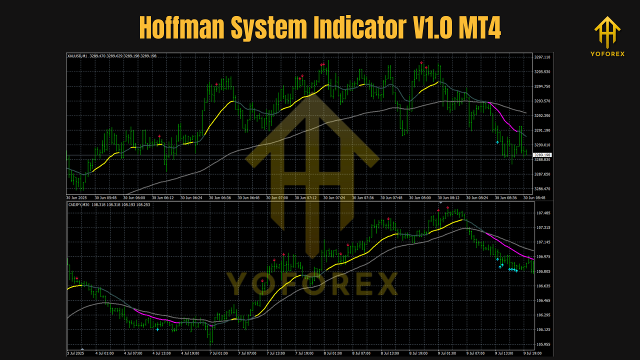 The Hoffman System Indicator is designed for the MetaTrader 4 platform and can scan multiple pairs and timeframes simultaneously. It combines trend detection, momentum confirmation, and volatility analysis into a single visual tool.