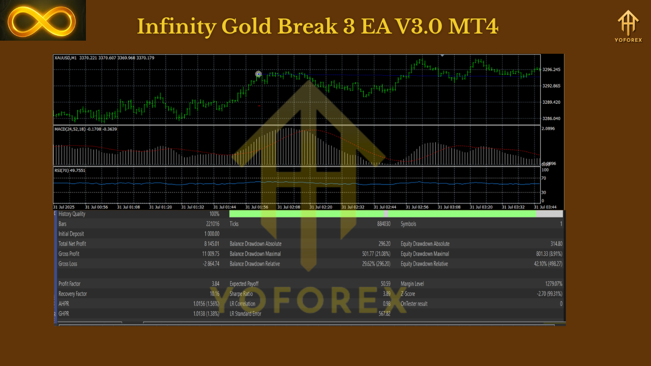 The Infinity Gold Break 3 EA V3.0 MT4 is designed to change that. Built as a fully automated breakout scalper, it is optimized for the M1 timeframe and engineered specifically for gold trading. By combining breakout logic with RSI + MACD confirmations, plus smart features like partial profit-taking, breakeven, and trailing stop, InfinityBreak v3.0 helps traders capture gold’s fast moves while keeping risk under control.