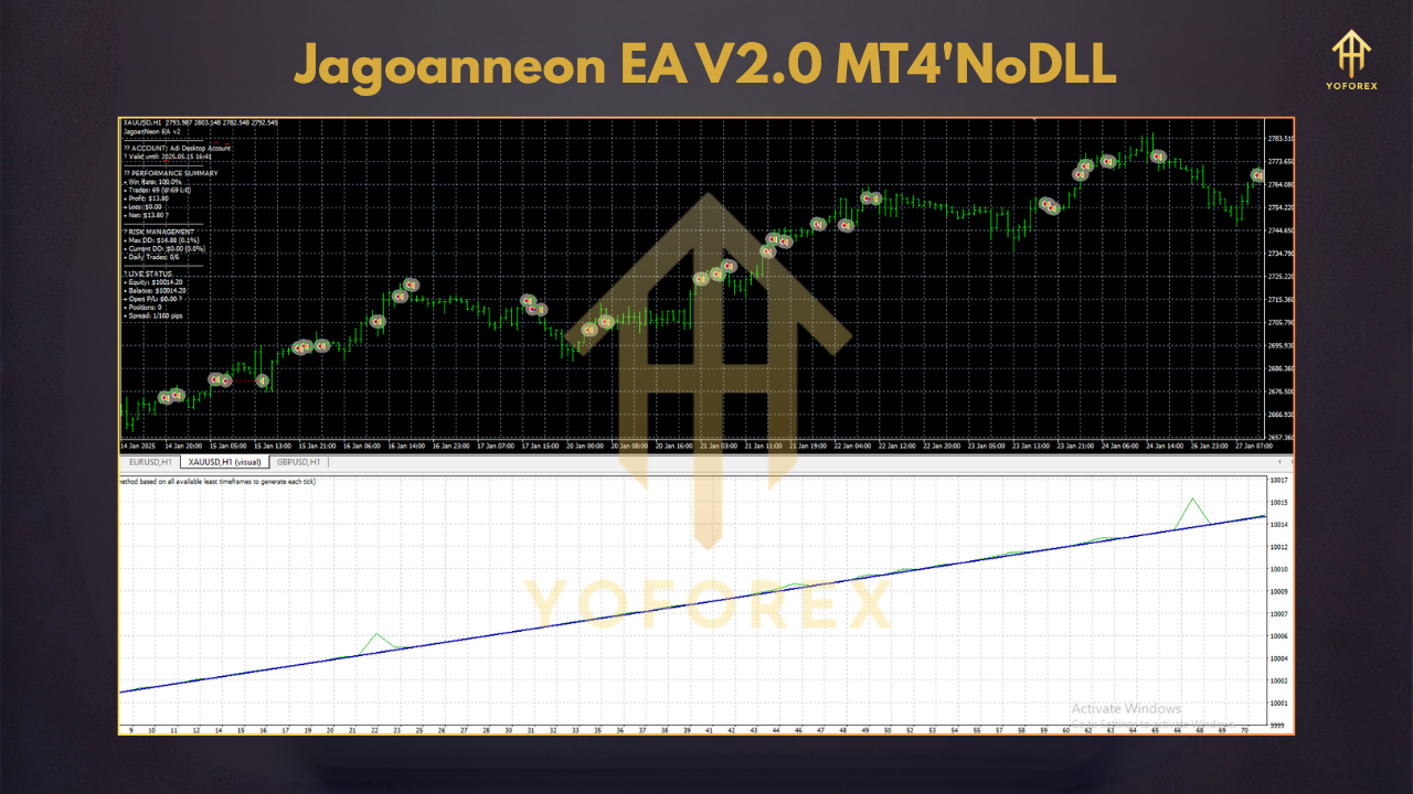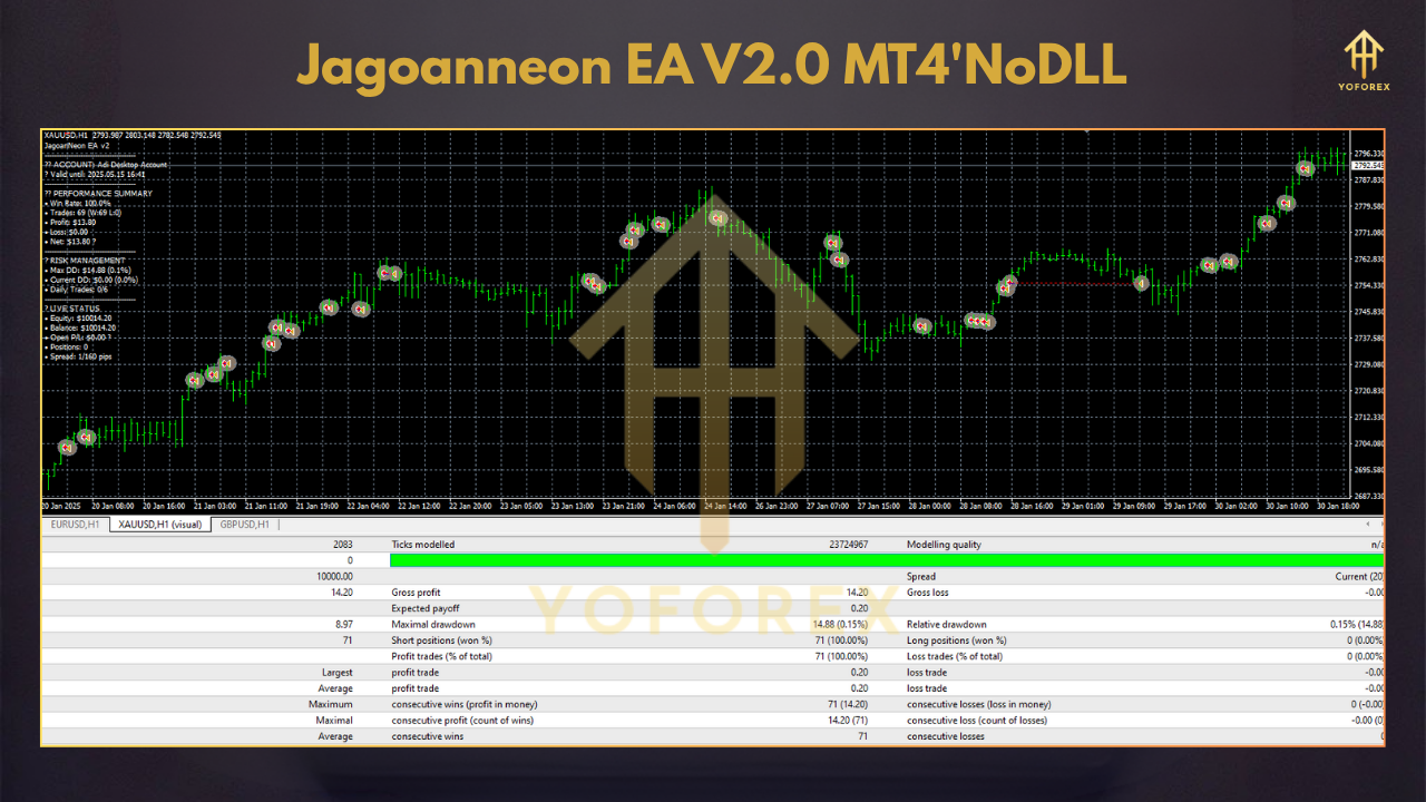 Our YoForex devs back-tested Jagoanneon EA V2 MT4 from January 1, 2014 through April 30, 2025 using 99.9% tick data on EUR/USD, GBP/USD, USD/JPY, and AUD/USD. To be extra sure, we ran a three-month live-demo trial—tweaking settings to handle real spreads, slippage, even news spikes. The result? Smooth equity curves, max drawdown under 4%, and consistent weekly gains.