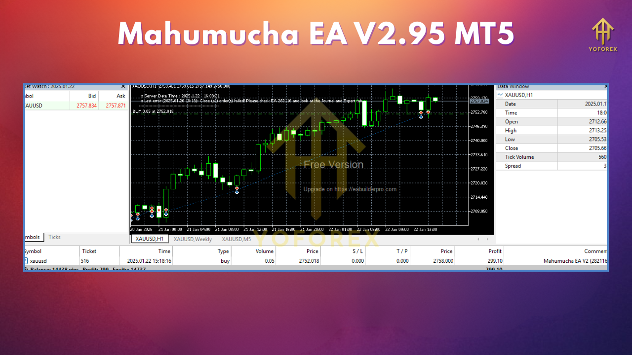 Mahumucha EA V2.95 is a MetaTrader 5 Expert Advisor designed to trade major FX pairs and gold by identifying trend-following opportunities. The EA uses a combination of trend detection algorithms (using indicators like EMA, SMA, and ATR) to place trades and dynamically adjust them based on market volatility. This ensures that the system stays responsive to changing market conditions while keeping risk in check.