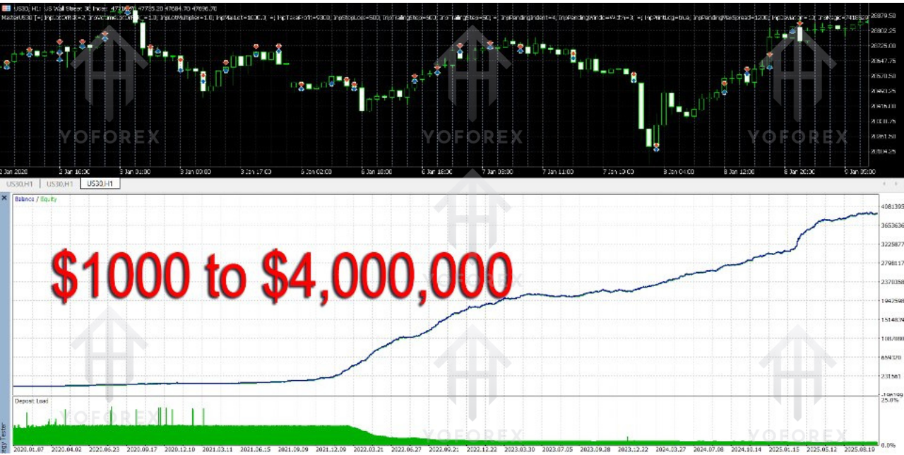 - US30 Optimization: Specifically built for trading the US30 index, the EA uses sophisticated algorithms to identify the best entry and exit points for US30 trades.