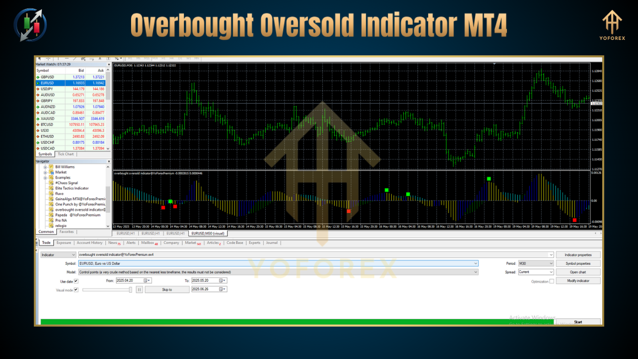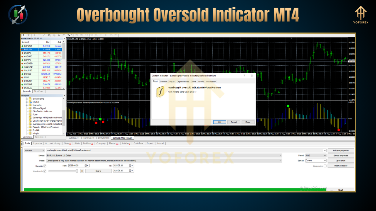 When the oscillator enters these zones, the indicator colors or highlights the area on your MT4 chart, often with shading or arrows. Some versions also provide configurable alerts (visual, pop-up, or email) when extremes are breached or when the oscillator returns to the neutral band, helping you avoid staring at screens all day.