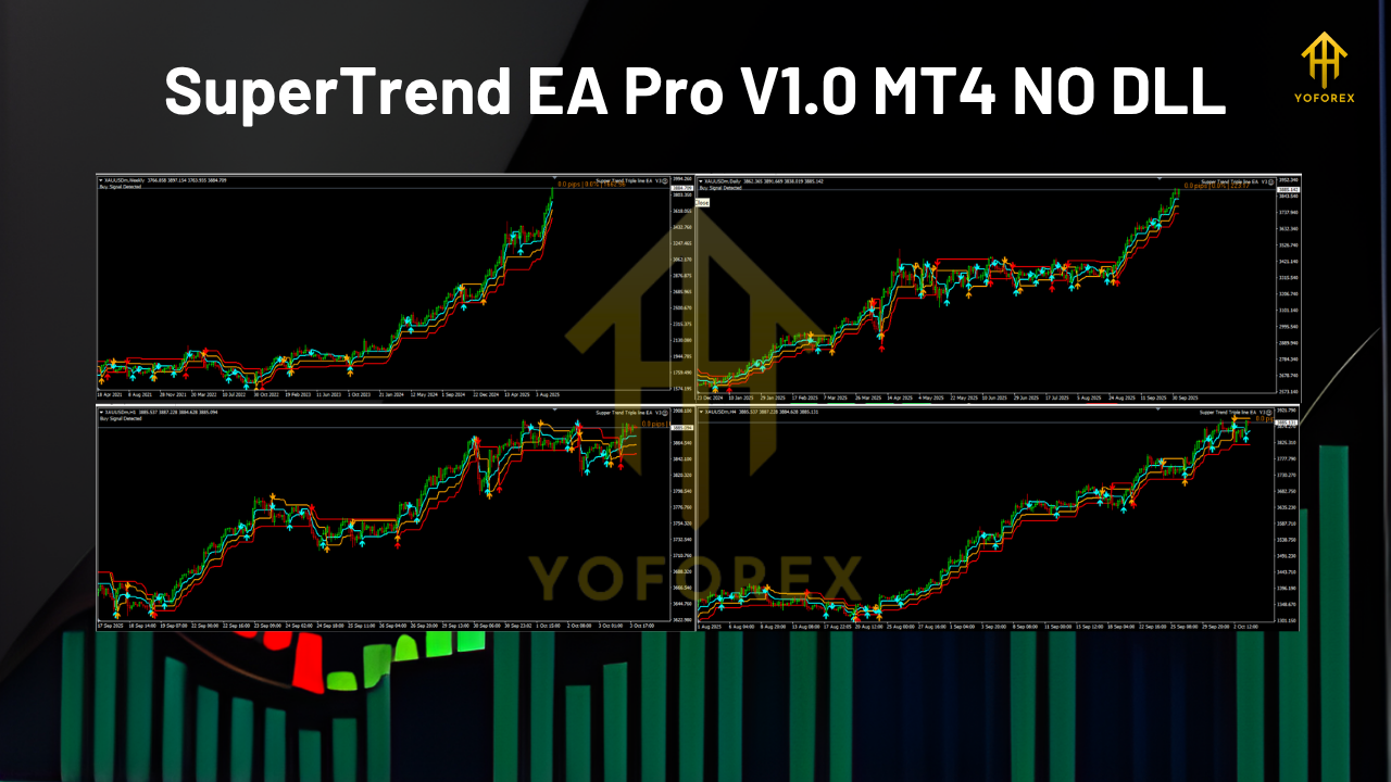 SuperTrend EA Pro is a MetaTrader 4 Expert Advisor that automates trend-based trading decisions. At its core, it uses the SuperTrend indicator — a dynamic tool based on price and volatility — to determine market direction and filter entries.